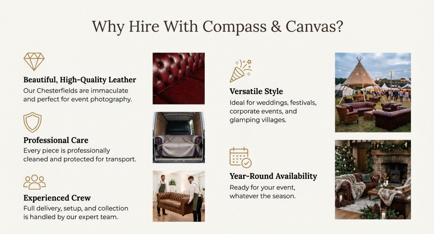 for your wedding, festival, or corporate event with our classic leather Chesterfield collection.
